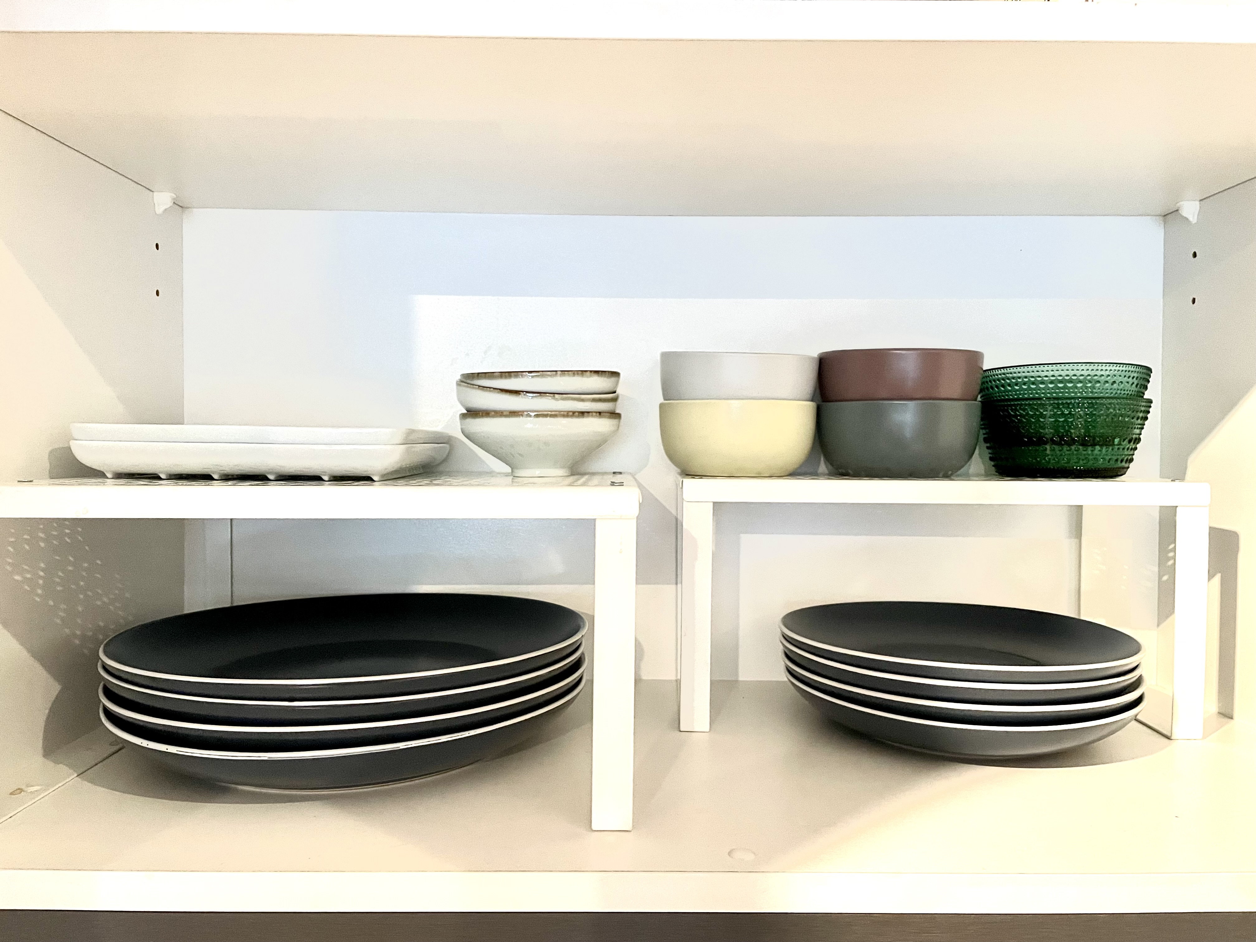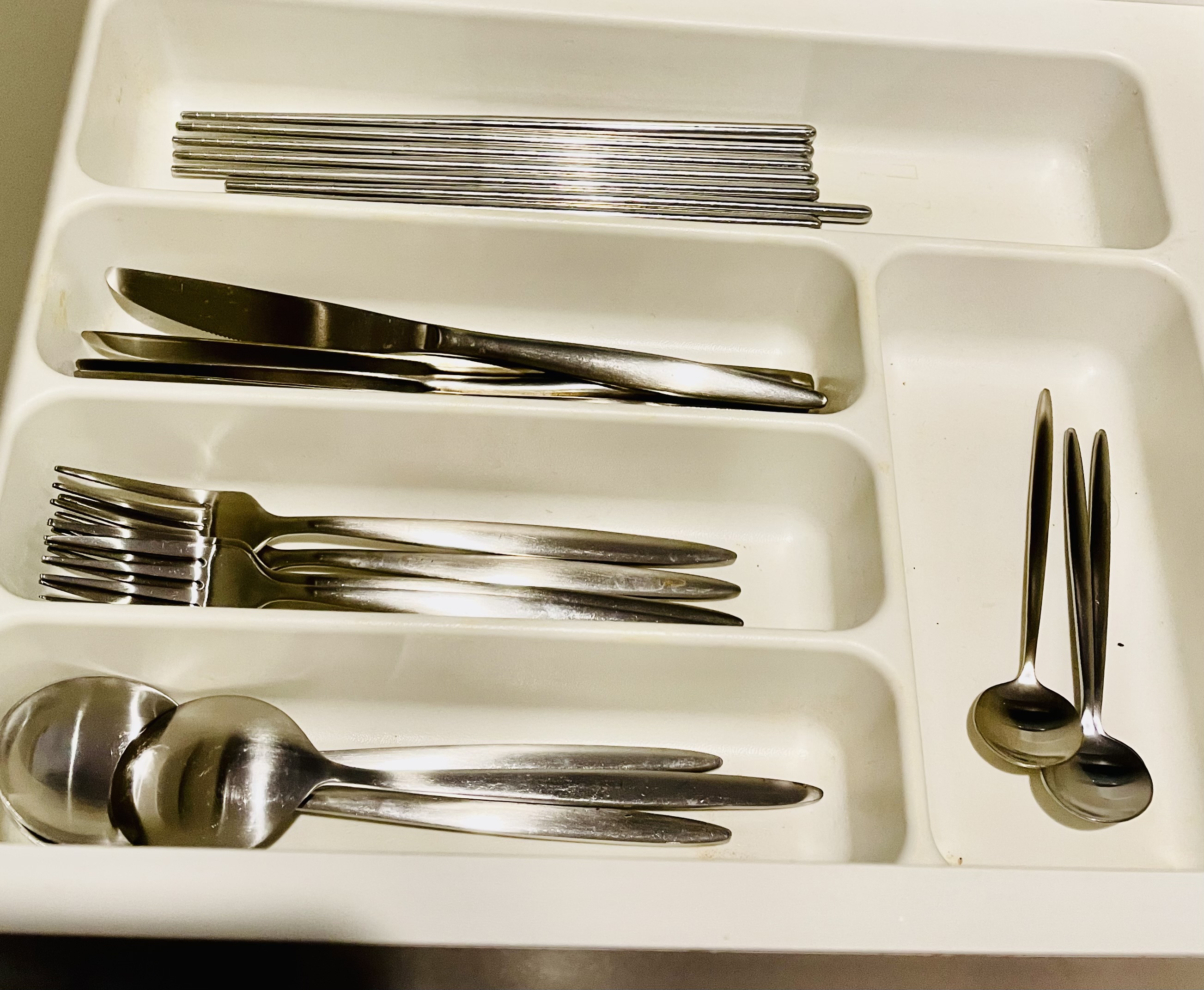 We have only one consistent style of cutlery. We are just two people at home after all. These are more than enough. We did make use of Ikea rack to separate dishes and bowl! It helps us to take them out smoothly, without lifting, moving around anything to reach to certain items we want to use.