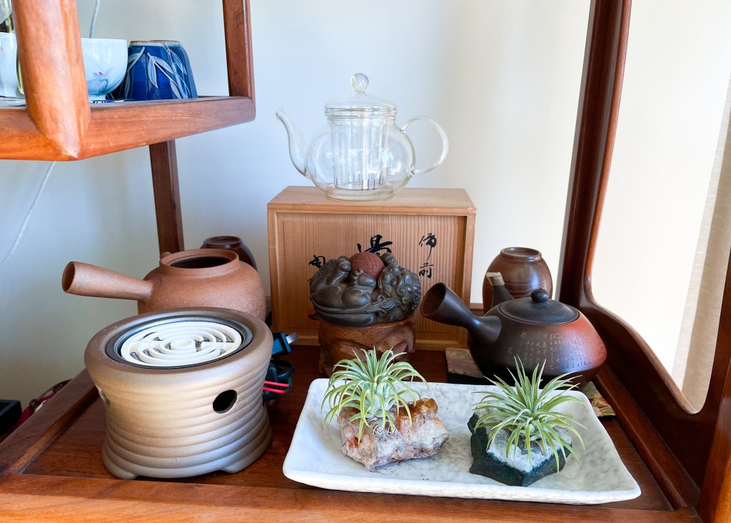 My parents love Chinese tea. They incorporate their tea setting with full of natural elements to accompany with house plants around them too. For example, bamboo screen, wooden plates, cray pot, red wood and bamboo furniture and minerals for the air plants to grow on.