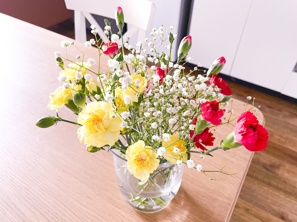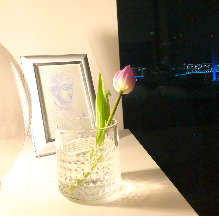 I adopted “Ichirin-Zashi” (一輪挿し)style … which means “single flower base” of Ikebana for this tulip 🌷 in the glass. It was on my bedside table with a drawing of my partner. I admired the beauty of one single stem of the flower before I fall a sleep for several night… feeling peaceful.
